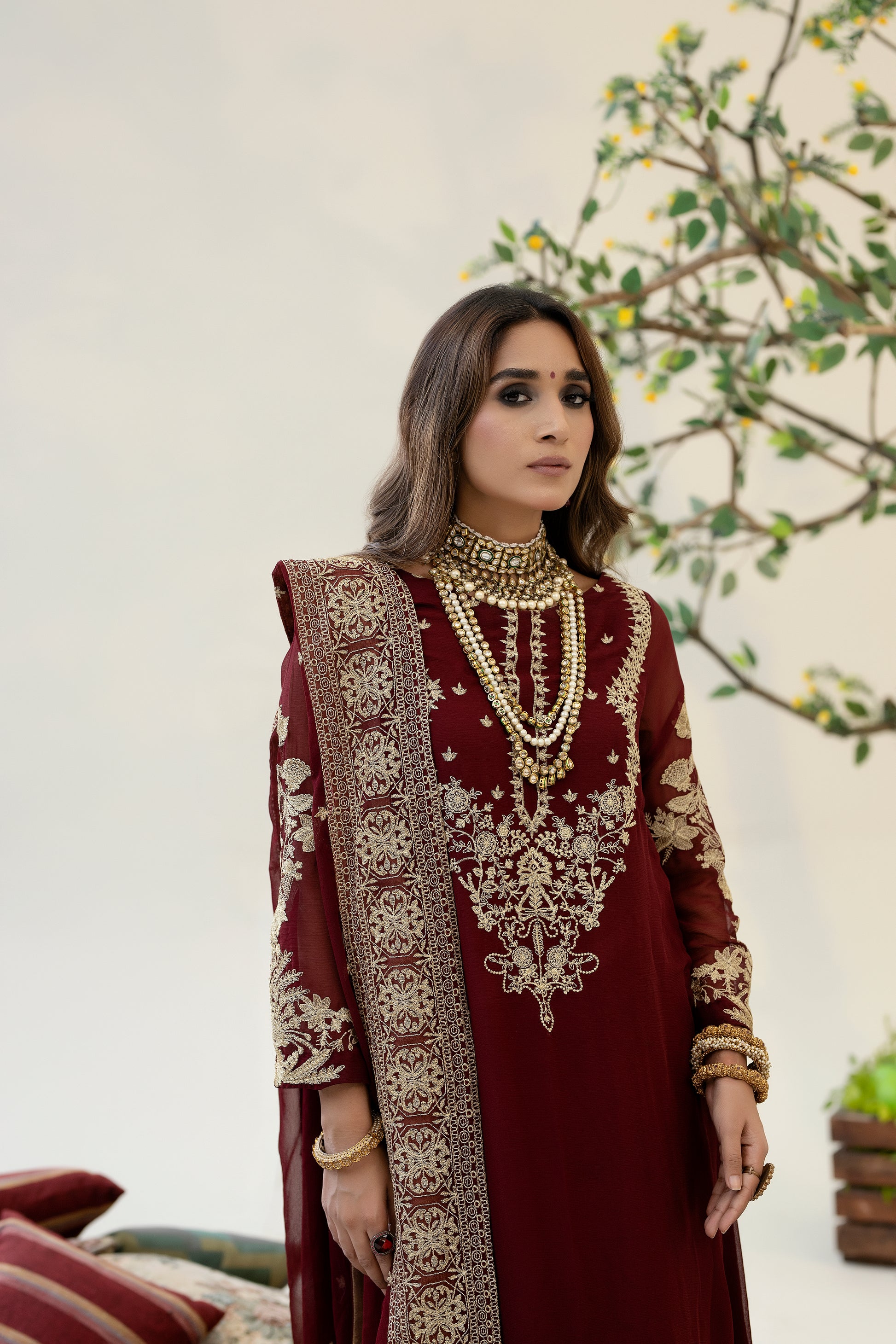 A majestic pure chiffon ensemble in a deep maroon hue, adorned with intricate antique tilla embroidery on neckline, sleeves, and daman. The rich craftsmanship and regal color make it a timeless festive choice. Paired with embroidered chiffon dupatta featuring ornate borders, this look is perfect for weddings, receptions, and grand evening soirees.
