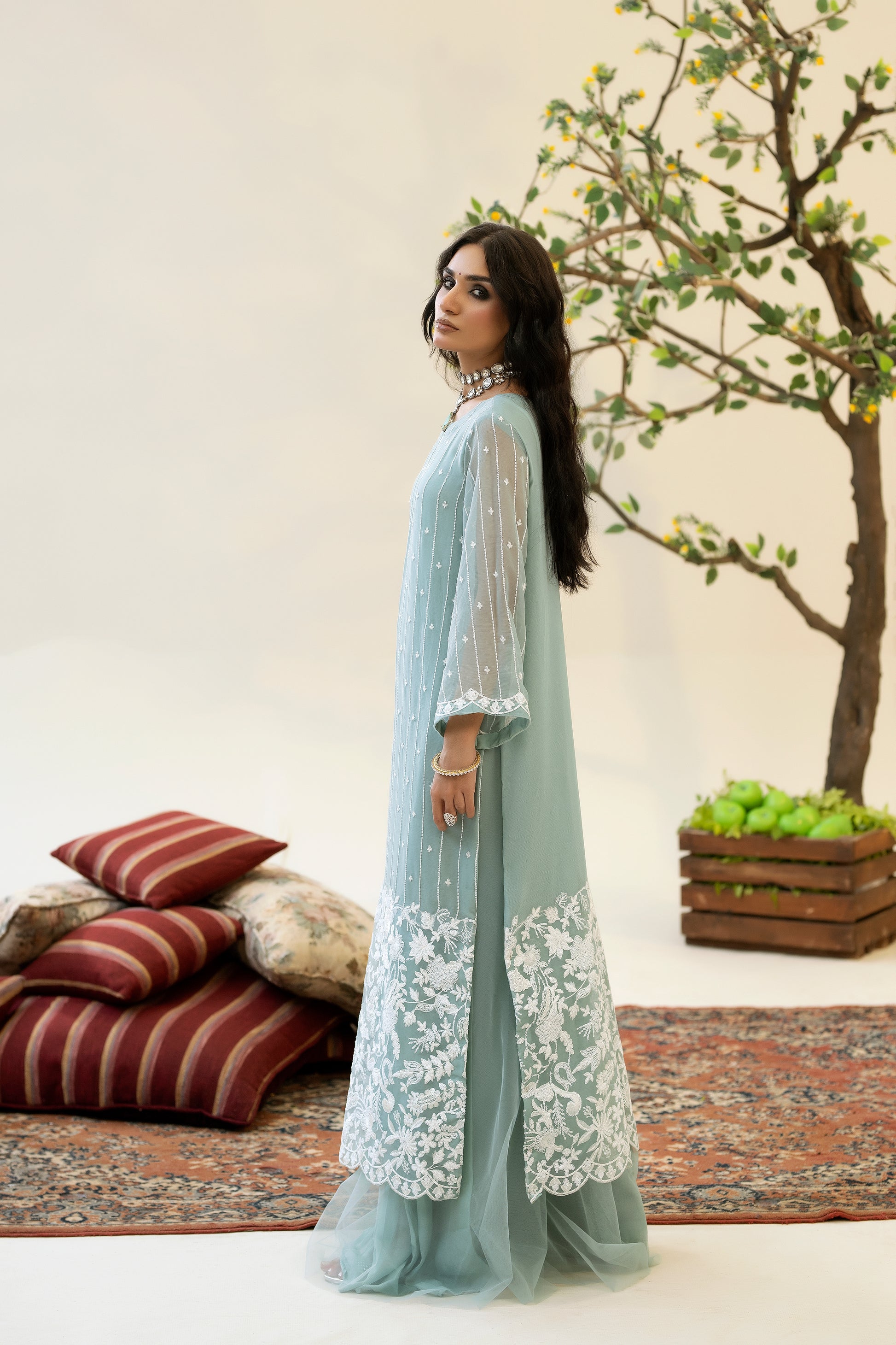 A serene pure chiffon ensemble in an icy aqua hue. The shirt features delicate vertical embroidery accented with sequins, flowing into a heavily embroidered daman adorned with intricate thread and sequin work. Paired with an embroidered chiffon dupatta, this look blends freshness and elegance – perfect for daytime weddings and refined festive gatherings.